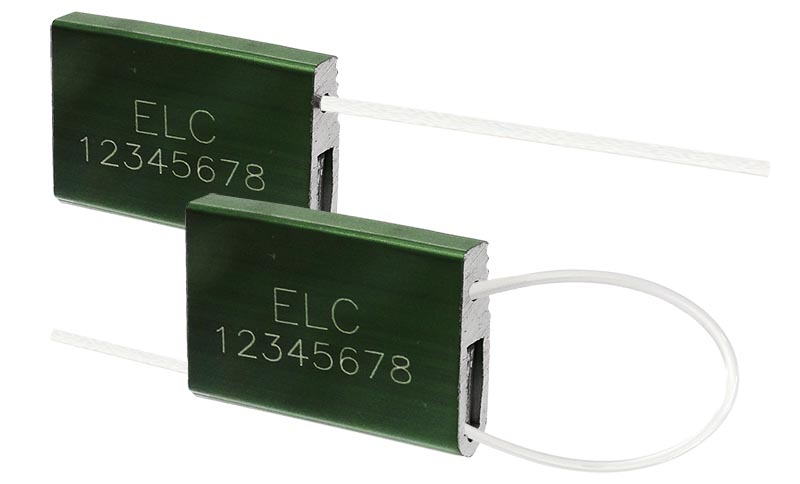 - Sello de cable con cierre en acero galvanizado 7 hilos que se rompe después del corte imposibilitando su recomposición, tamaño de 20 cm y diámetro de 1,5 mm. Personalización y codificación alfanumérica grabados por láser en el cuerpo del sello.