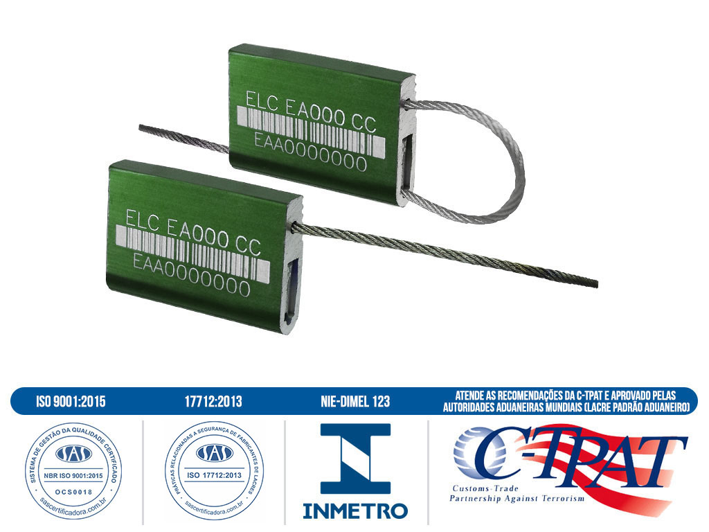 Sello metálico, cuerpo en policarbonato, mecanismo de cierre metálico, blindado e independiente, cable en acero inoxidable o galvanizado 7 hilos, con diámetro de 1,6 mm y tamaños variados según la necesidad. Resistencia a tracción 227 daN.