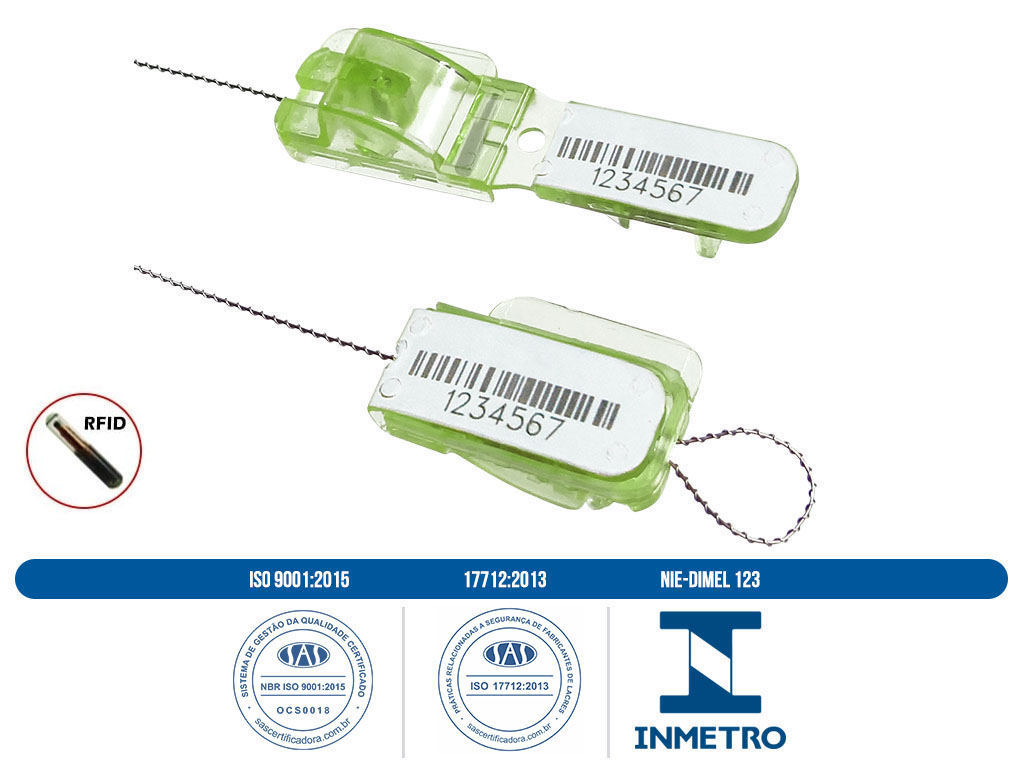 El sello de seguridad E-Lock fabricado en policarbonato, con ID interno para lectura utilizando un terminal de recolección de datos portátil, o mismo un lector de pasillo. La codificación ocurre en códigos de ID únicos y programados por láser. La codificación alfanumérica grabada sobre el sello, compuesta de 10 dígitos alfanuméricos aleatorios y sin repetición, es la misma del microtransponder, permanente e inalterable.